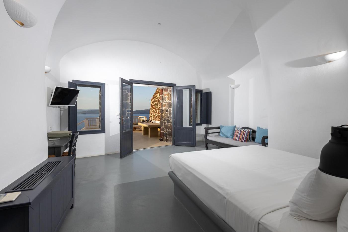 Deluxe Cave Suite with Private Pool & Caldera View. This suites special feature is the pool with a view. Featuring a private entrance, this air-conditioned suite consists of 1 living room, 1 separate bedroom and 3 bathrooms with a bath and a shower. Boasting a terrace with sea views, this suite also provides soundproof walls and a flat-screen TV with cable channels. The unit offers 1 bed. ;