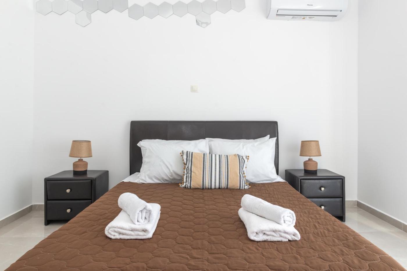 Two-Bedroom Apartment. This spacious apartment comprises 1 living room, 2 separate bedrooms and 1 bathroom with a walk-in shower. In the well-equipped kitchen, guests will find a stovetop, a refrigerator, kitchenware and an oven. There is air conditioning, a washing machine and a terrace and complimentary winechampagne is provided for guests. The unit offers 5 beds.