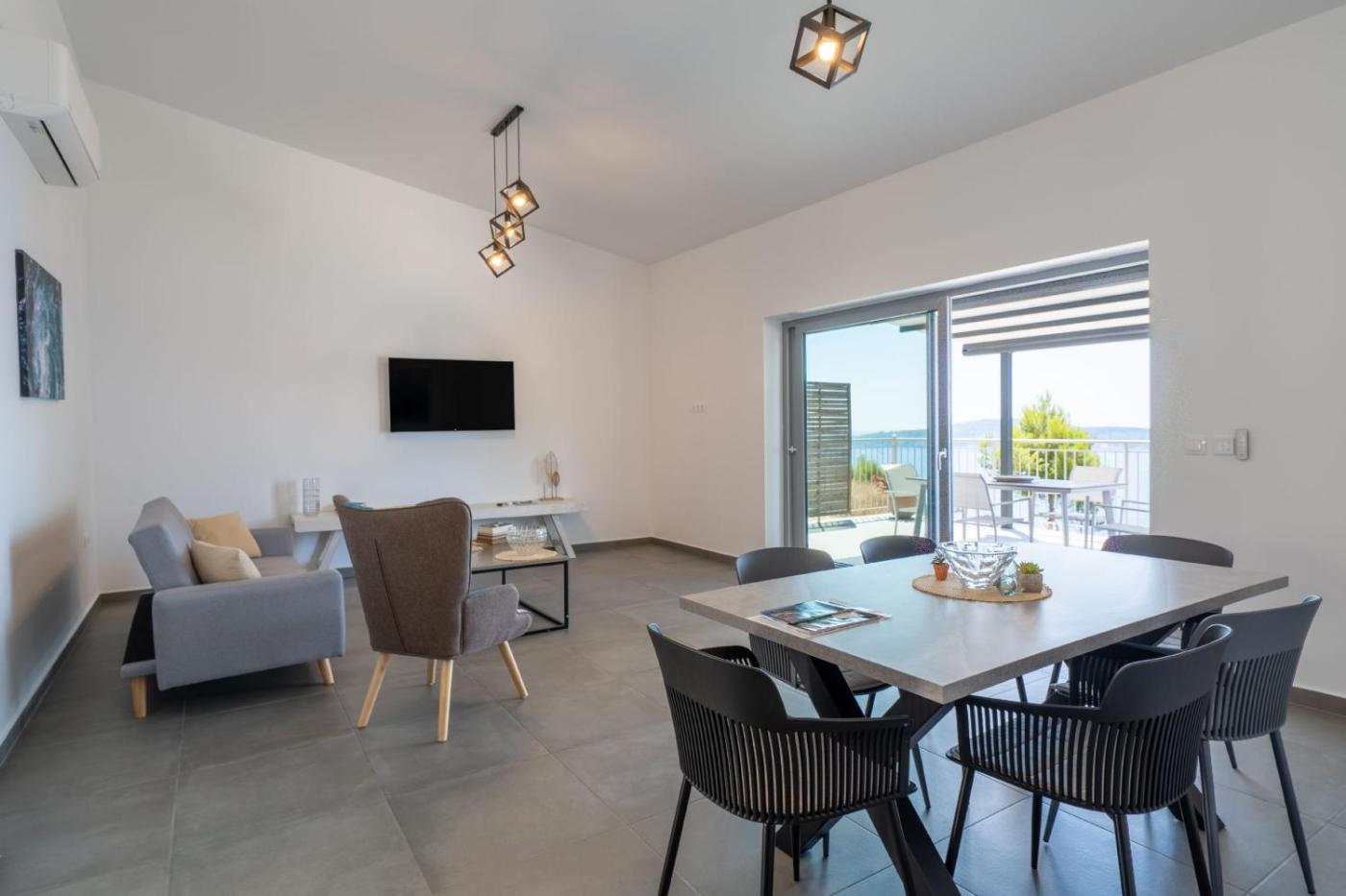 The villa with a terrace and sea views has 2 bedrooms, a living room, a TV, an equipped kitchen with a dishwasher and an oven, and 2 bathrooms with a shower. Towels and bed linen are available in the villa. The property has an outdoor dining area.