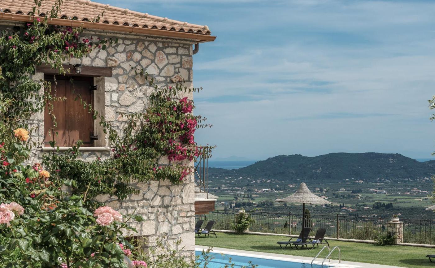 One-Bedroom Apartment. Stone-built, small villa with a furnished balcony overlooking the Ionian Sea and the well-tended garden. Guests have access to a shared, outdoor pool with sun loungers and grass umbrellas. Fully air conditioned, this villa consists of a separate bedroom and fully equipped kitchen with dining area. The living room comes with a fireplace and flat-screen TV with cable channels. Some villas also come with a hydromassage shower. Free Wi-Fi and wired internet are provided. ;