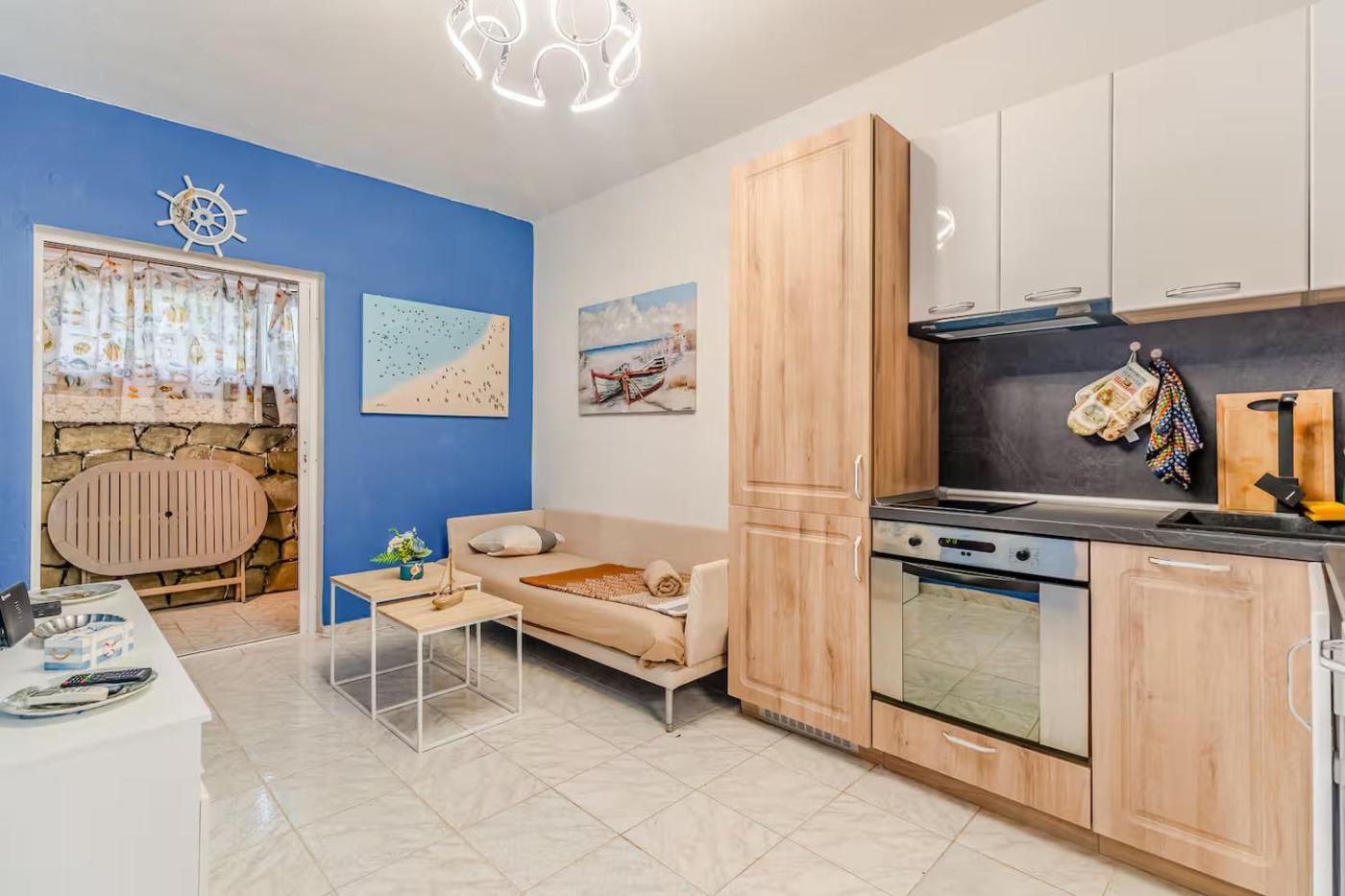 Three-Bedroom Apartment. This air-conditioned apartment has 3 bedrooms, 1 bathroom and a living room with seating and dining areas. In the well-equipped kitchen, guests will find a stovetop, a refrigerator, kitchenware and an oven. The spacious apartment offers a washing machine, soundproof walls, a tea and coffee maker, a wardrobe, as well as a flat-screen TV. The unit has 5 beds.