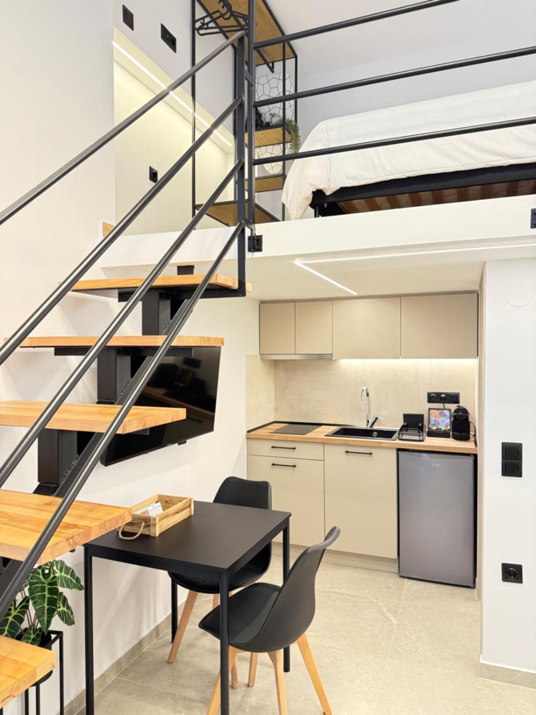 One-bedroom Loft Apartment. Featuring a private entrance, this air-conditioned apartment comprises 1 living room, 1 separate bedroom and 1 bathroom with a shower and a hairdryer. Meals can be prepared in the well-fitted kitchen, which is equipped with a stovetop, a refrigerator, kitchenware and a tea and coffee maker. The apartment features tiled floors, a seating area with a flat-screen TV, a wardrobe, a sofa, as well as heating. The unit offers 2 beds. ;