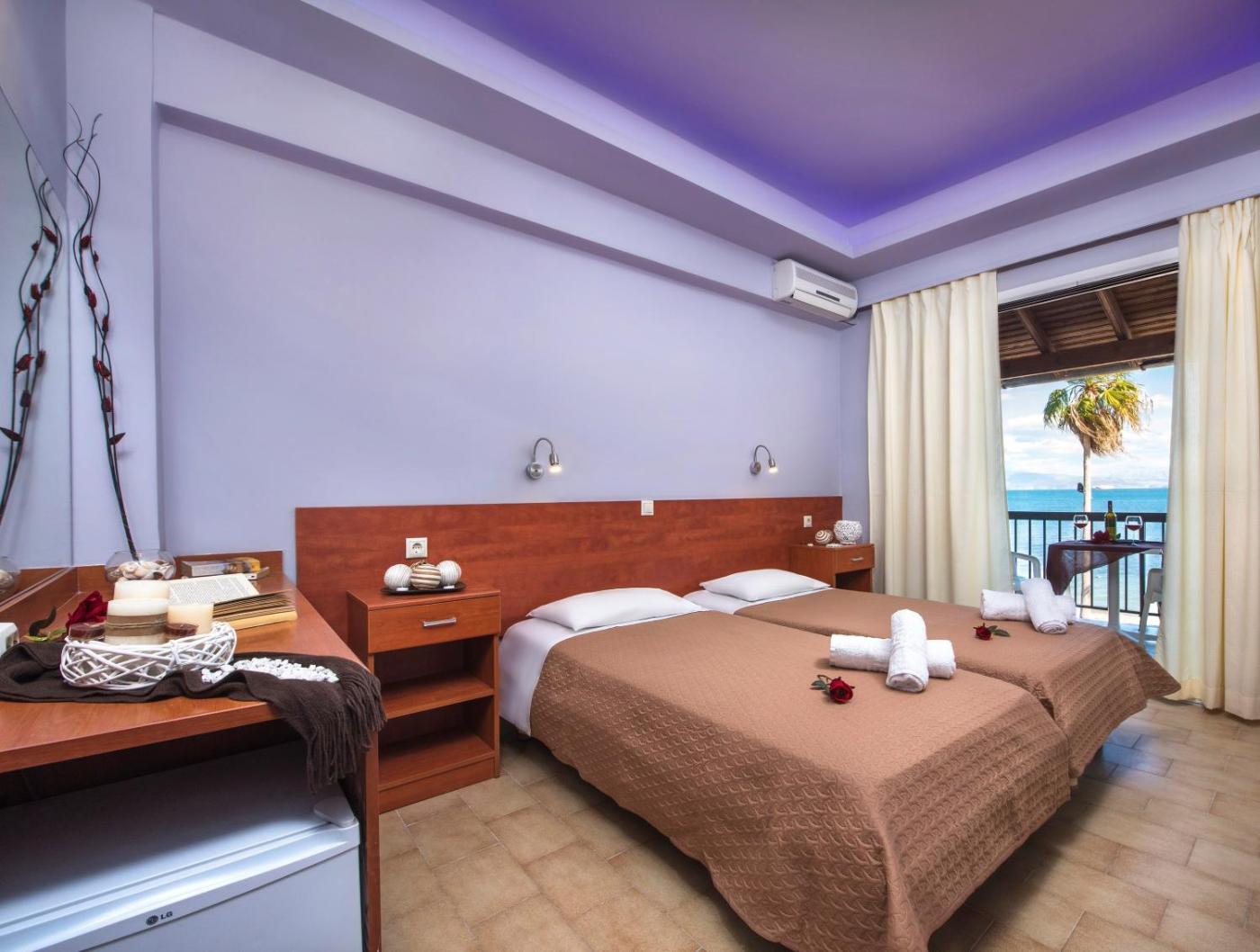 Standard Twin Room with Sea View. This air-conditioned room opens to a balcony with mountain and sea views. It also features a satellite TV, free WiFi and refrigerator. ;